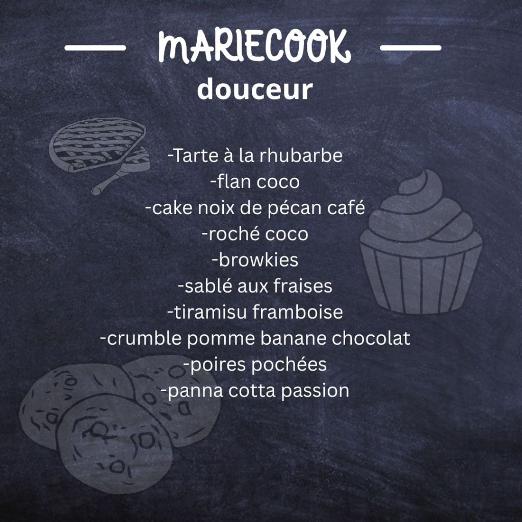 Marie, 41 ans et maman de 2 adolescents, j’ai fait mes études dans l’hôtellerie restauration au lycée de Dinard. J’ai d’abord travaillé en tant que serveuse et j’ai vite pris goût à la cuisine en aidant les chefs, puis en étant commis. Ensuite, avec mon conjoint, je me suis lancé dans un projet un peu fou : Agricultrice. J’ai ouvert un magasin à la ferme avec laboratoire de découpe et de transformation ainsi qu’une activité traiteur. Nous avons ensuite pris le large 5 ans durant lesquels nous avons parcouru le monde et pris le temps de profiter de nos enfants. Aujourd’hui me voici à Vannes pour combler vos papilles grâce à mon savoir-faire.
